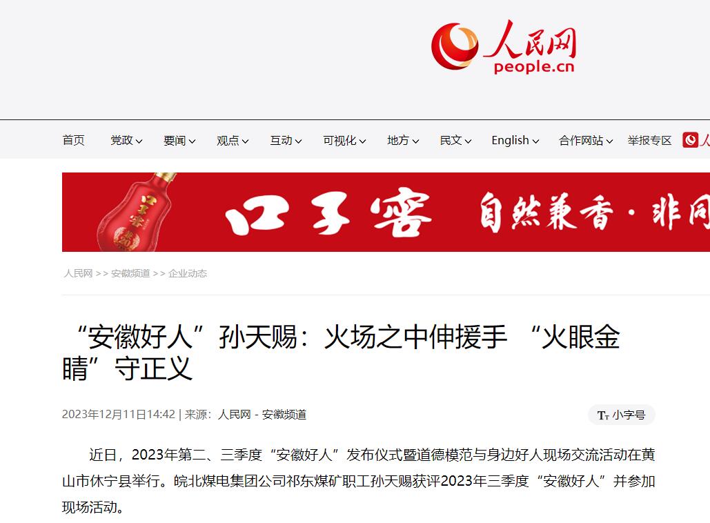 12月11日人民網(wǎng):“安徽好人”孫天賜:火場(chǎng)之中伸援手 “火眼金睛”守正義