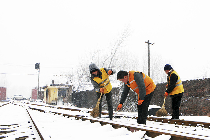 圖二:該礦運(yùn)銷(xiāo)部組織職工在清掃線路道岔積積雪,保障鐵路安全暢通。