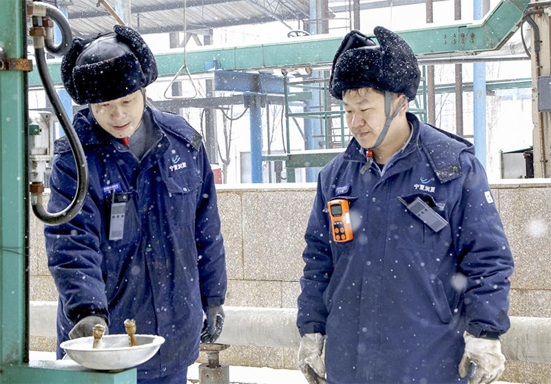圖片說(shuō)明:2月3日,寧夏中衛(wèi)市迎來(lái)了強(qiáng)降雪天氣,天寒地凍、白雪飛舞,寧夏潤(rùn)夏能源化工公司濃硝酸車(chē)間三組現(xiàn)場(chǎng)巡檢人員在裝置現(xiàn)場(chǎng)檢查重大危險(xiǎn)源硝酸罐區(qū)洗眼器出水是否正常。